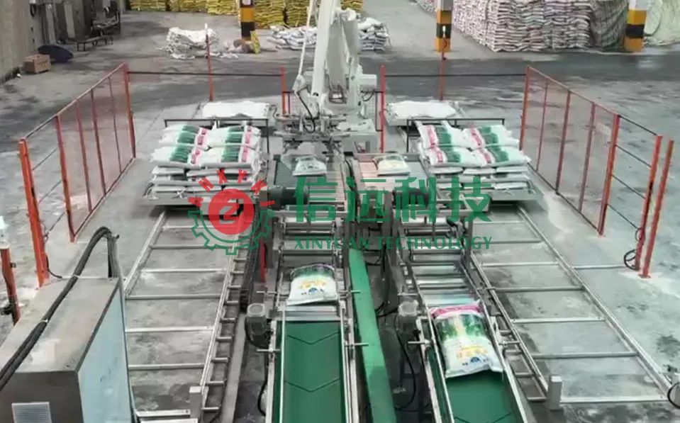 El equipo de línea de producción de envasado y paletizado totalmente automático para fertilizantes orgánicos, diseñado y fabricado por Anhui Xinyuan Packaging Technology Co., Ltd., es un sistema de envasado y paletizado de bolsas pesadas, compuesto por máquinas de carga de bolsas, máquinas de envasado, máquinas de coser, impresoras de inyección de tinta, sistemas de transporte y clasificación, robots de paletizado y vehículos de orugas para palés, etc. Puede completar automáticamente la toma de bolsas, la carga de bolsas, la apertura de bolsas, el llenado de bolsas, la sujeción de bolsas y el llenado dosificador. Cuando el peso dentro de la bolsa alcanza el valor establecido, el llenado se detendrá automáticamente y la bolsa se liberará y caerá. El dispositivo de sujeción de bolsas se trasplantará automáticamente al frente de la máquina de coser para completar el sellado de la bolsa de envasado. Durante el proceso de transporte de las bolsas terminadas, se completa automáticamente el ensacado, la compactación, el aplanamiento y otras operaciones de ensacado y conformación. Luego, el robot toma las bolsas y las apila. Los vehículos de orugas para palés pueden estar equipados con opciones de estación simple o doble.